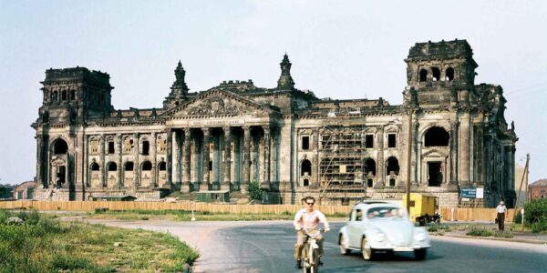 1958 in Berlin: Das zerstörte Reichstagsgebäude kurz vor seiner ersten Restaurierung – Ein Symbol zwischen Ruine und Neubeginn.H