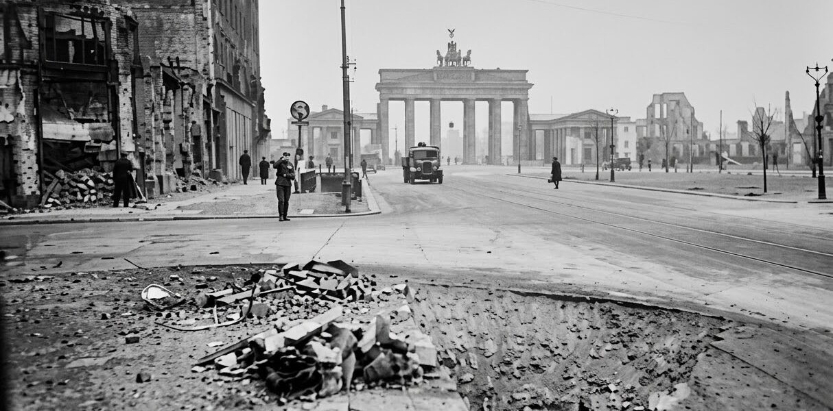Besonders eindrucksvoll ist eine Aufnahme aus jener Zeit: Eine nahezu menschenleere Straße führt direkt auf das Brandenburger Tor zu. Im Vordergrund klafft ein großer Bombentrichter im Asphalt. Daneben liegen Ziegel, Holzreste und Metallteile – Überbleibsel zerstörter Häuser. Die wenigen Menschen, die sich auf der Straße bewegen, wirken klein und verloren inmitten der Ruinen. Es ist ein Moment, der die Stimmung jener Tage einfängt: Erschöpfung, Unsicherheit und das Gefühl, dass eine ganze Epoche zu Ende geht.