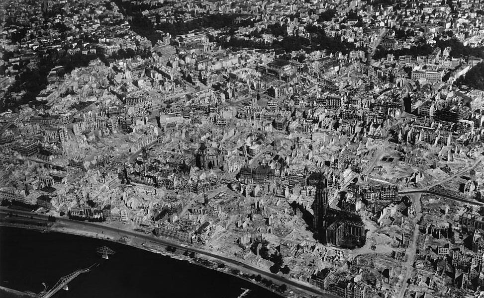 Die Fotografien aus dieser Zeit besitzen eine eindringliche Kraft. Sie zeigen nicht nur zerstörte Architektur, sondern auch die Leere zwischen den Ruinen – breite Schneisen, wo einst enge Straßenzüge standen. Kirchen ohne Dächer, ausgebrannte Fassaden, eingestürzte Innenhöfe. Aus der Vogelperspektive wirkt das Stadtzentrum fast unkenntlich.
