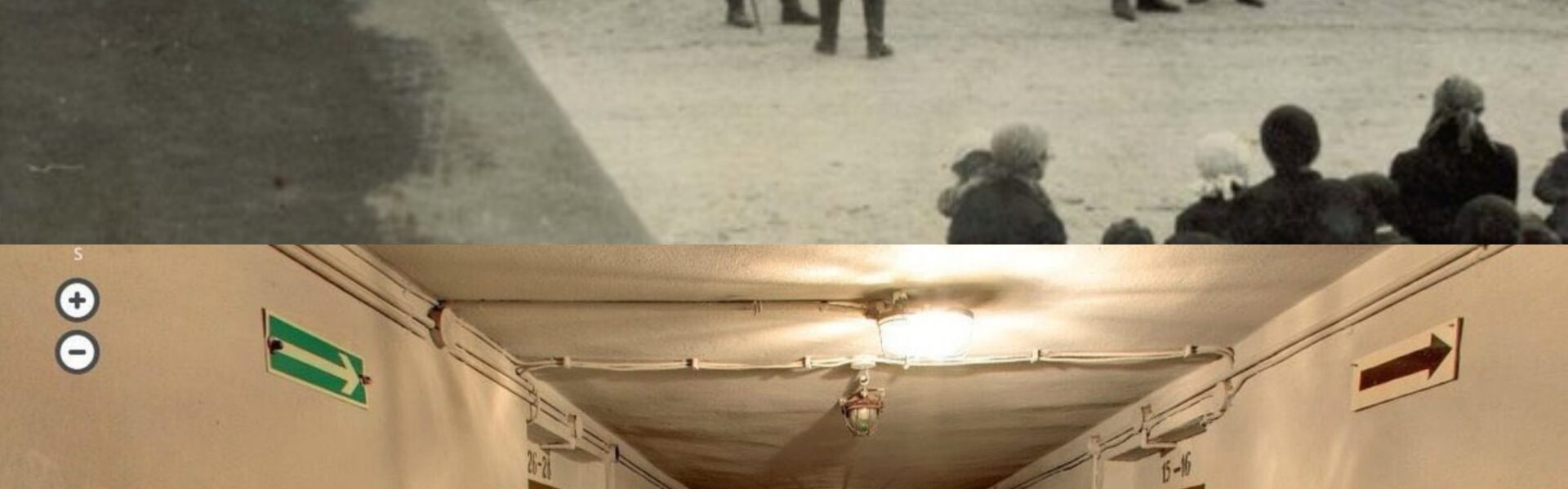 Interior view of a corridor of the basement of Block 11 at the Auschwitz I site. Walls on both sides and a barred gate at the end, directional signage visible on the walls.