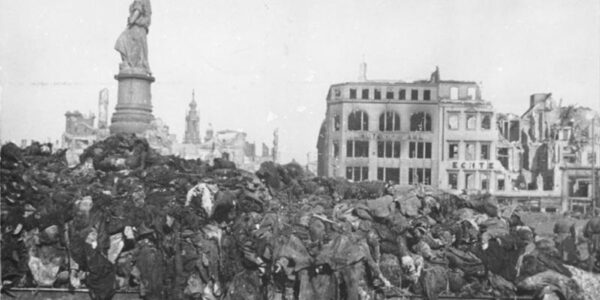 Nach dem Bombenangriff auf Dresden im Februar 1945 wartet ein Berg von Leichen auf ihre Einäscherung. Die Bombardierung Dresdens im Februar 1945 ist bis heute einer der umstrittensten Momente des Zweiten Weltkriegs. Dresden, eine Stadt, die bis dahin von Bombenangriffen…