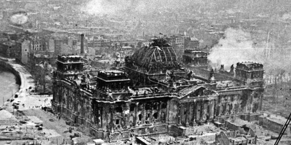Der Reichstag nach der Schlacht um Berlin, 1945 – ein erschütterndes Symbol des Kriegsendes.H