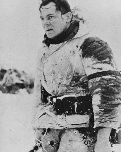 Winteranzug, den Blick entschlossen, müde, aber wachsam. Der Schnee klebt an seiner Kleidung, das Gesicht ist gerötet von der Kälte, die Lippen leicht geöffnet – als atme er schwer. Seine Hand hält eine Waffe, aber sein Blick verrät: Dies ist kein Moment des Kampfes, sondern der Erschöpfung, der inneren Sammlung. Es ist ein stilles Porträt des Krieges, aufgenommen irgendwo an der Ostfront, wahrscheinlich im Winter 1942 oder 1943 – zur Zeit der erbarmungslosen Kämpfe um Stalingrad oder im Weichselbogen.