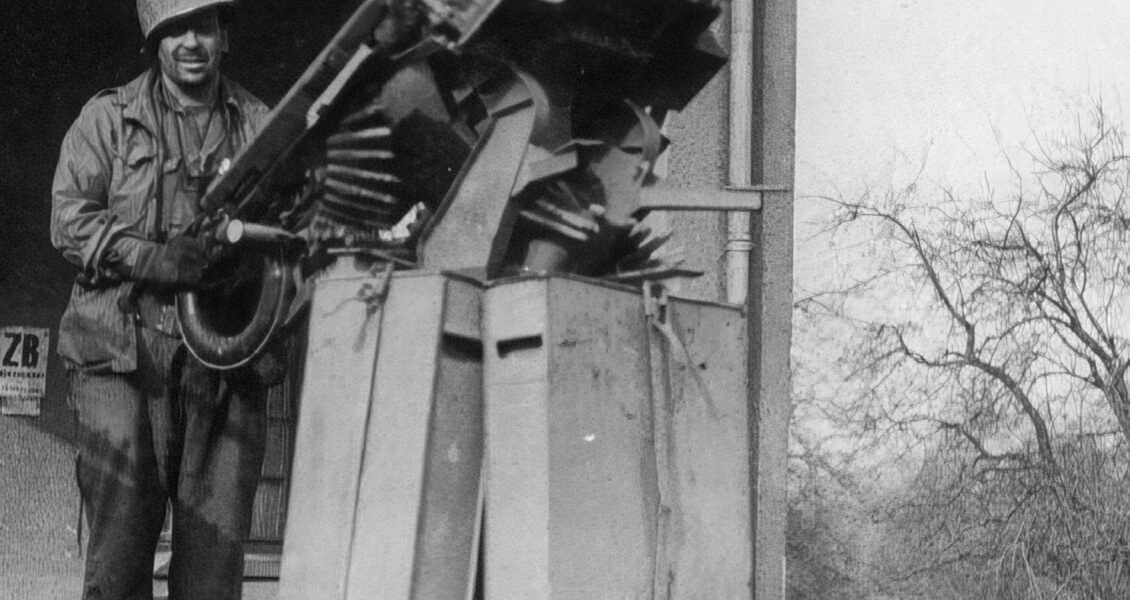 Das Schwarz-Weiß-Foto wirkt auf den ersten Blick unscheinbar, doch bei genauerem Hinsehen offenbart es eine dichte, fast beklemmende Geschichte. Entstanden in Deutschland im Jahr 1945, zeigt die Aufnahme einen deutschen Soldaten in einem halb zerstörten Gebäude. Vor ihm steht eine schwere technische Anlage, darüber dicke Kabel, daneben sauber aufgestapelte Munition – stumme Zeugen der letzten Tage des Zweiten Weltkriegs.