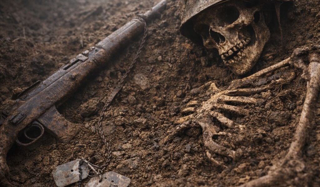 Während der archäologischen Arbeiten bemerkte ein Teammitglied eine ungewöhnliche Metallstruktur im Boden. Nachdem die Erde vorsichtig entfernt worden war, erschien zunächst ein stark korrodierter Stahlhelm. Wenige Zentimeter darunter wurde schließlich ein menschlicher Schädel sichtbar. Schritt für Schritt legten die Archäologen die gesamte Grabstelle frei und bestätigten, dass es sich um das vollständige Skelett eines Soldaten handelte, der offenbar genau an der Stelle gefallen war, an der er gefunden wurde.