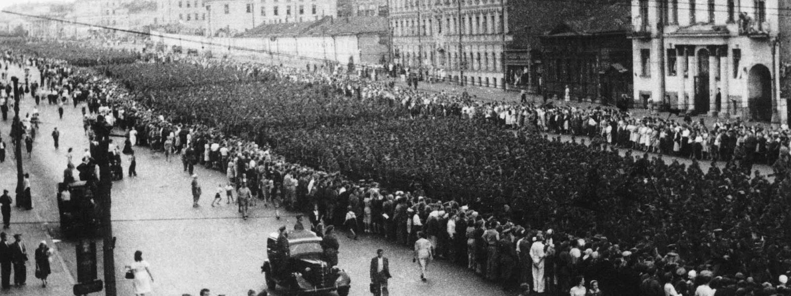 Parade von 57.000 deutschen Kriegsgefangenen in den Straßen Moskaus. Unter Eskorte 1944.