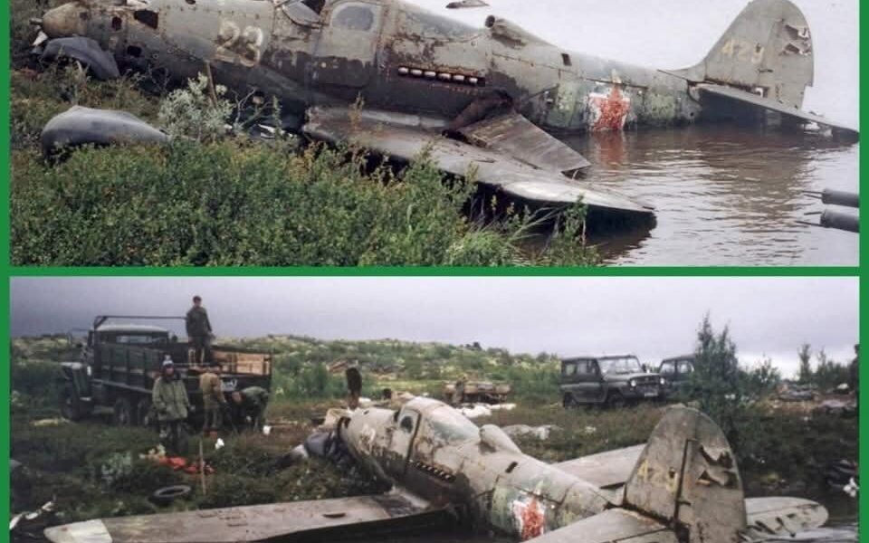Das Flugzeug, vermutlich ein Jagdflugzeug vom Typ Messerschmitt Bf 109 oder Focke-Wulf Fw 190, liegt halb im Wasser eines kleinen Sees. Die markante Lackierung, das verblasste Hoheitszeichen und die noch lesbare Nummerierung am Rumpf erzählen von seiner Vergangenheit. Es handelt sich höchstwahrscheinlich um eine Maschine, die während der erbitterten Kämpfe an der Ostfront zwischen 1941 und 1944 abgestürzt ist – eine Zeit, in der Tausende Flugzeuge beider Seiten ihr Ende in den Wäldern Russlands fanden.